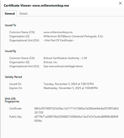 Em caso de dúvida, confirme a origem do Certificado Digital - efectuando o duplo clique sobre o cadeado - e verifique se corresponde, efectivamente, à Sucursal de Macau;